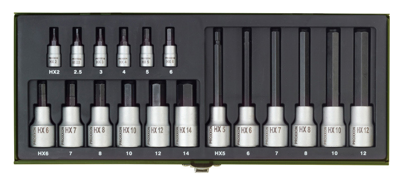 Profesjonalny, 18-częściowy zestaw specjalistyczny PROXXON do śrub imbusowych. Dla nasadek 1/4" (6,3 mm) i przenoszonych momentów obrotowych do 25Nm, SW 2 – 6 mm. Dla nasadek 1/2" (12,5 mm) i przenoszonych momentów obrotowych od 25-210Nm; SW 6 – 14 mm (wersja krótka 55 mm) SW 5 – 12 mm (wersja...