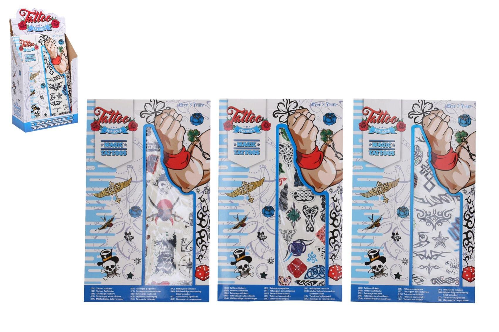 Tetovací samolepky kluci. Více variant v display boxu. Rozměry archu: 15,3x0,1x25cm. Návod na aplikaci na obale: Sloupnout folii, přilepit papír s tetováním na pokožku, namočit a přitlačit houbičkou, sundat opatrně papír. przeczytaj całość