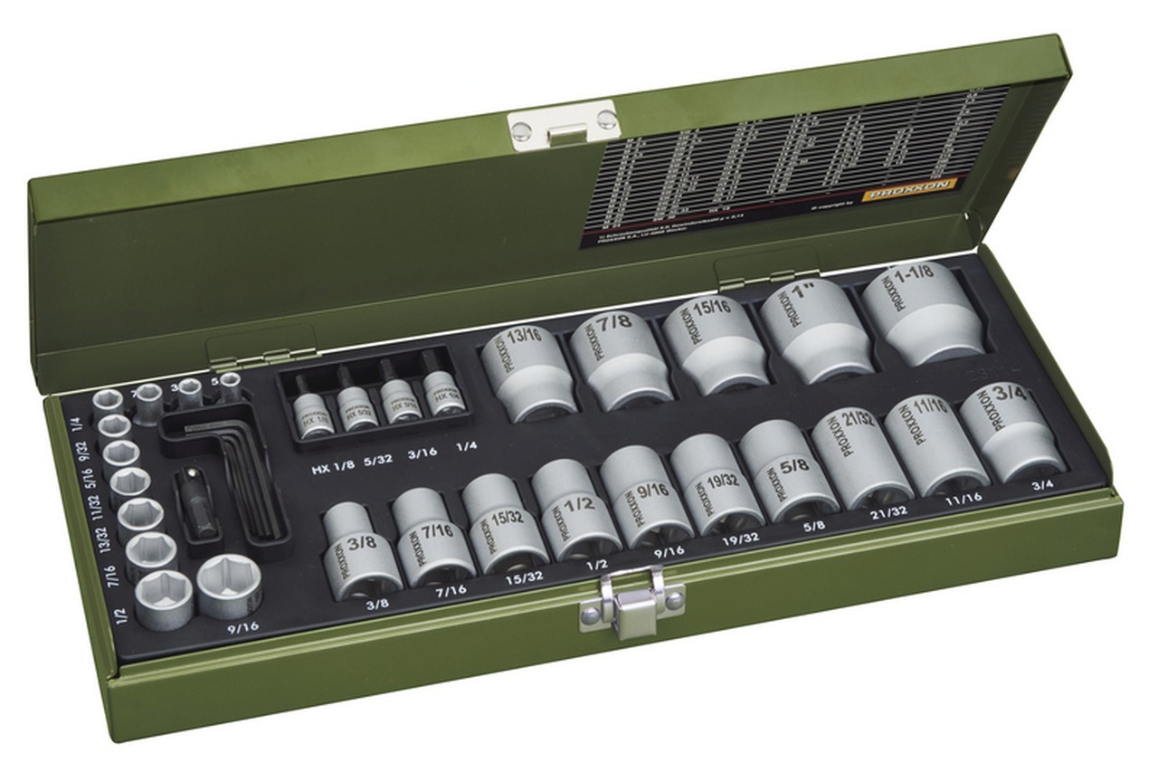 Nasadki 1/4 (6,3mm): 5/32"-3/16"-7/32"-1/4"-9/32"-5/16"-11/32"-13/32"-7/16"-1/2"-9/16". Nasadki HX 1/8"-5/32"-3/16"-1/4".Nasadki 1/2" (12,5mm): 3/8"-7/16"-15/32"-1/2"-9/16"-19/32"-5/8"-21/32"-11/16"-3/4"-13/16"-7/8"-15/16"-1"-1 1/8".Dodatkowo 5 kluczyków typu L: 0,05"-1/16"-5/64"-3/32"-1/8"....