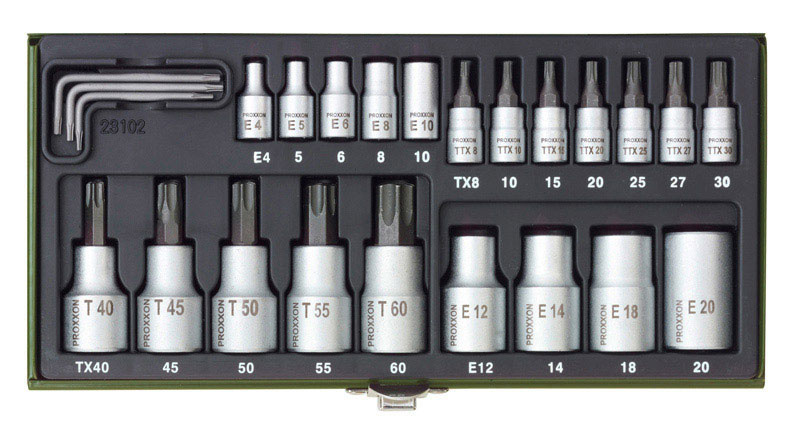 Zestaw profesjonalnych kluczy PROXXON TX –24 części. Nasadki TX dla napędu 1/4" (6,3 mm) od TX8 do TX30 (z otworem) oraz E4 do E10 (wszystkie o dopuszczalnym nacisku 25Nm). Dla napędu 1/2" (12,5 mm) TX 40 – 60 oraz E12 – E20 dla momentów obrotowych od 25 – 135Nm). Trzy klucze imbusowe odgięte TX...