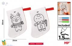 Świąteczna skarpeta do pokolorowaniaWymiary: 20x30 cm.Wykonana z białej tkaniny poliestrowo-bawełnianej, miękka w dotyku, łatwa do kolorowania, z wyraźnymi nadrukowanymi motywami.W zestawie 3 flamastry (czerwony, zielony, żółty).Skarpeta i 3 markery są zapakowane razem w torbę OPP.Motyw...