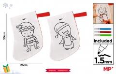 Świąteczna skarpeta do pokolorowaniaWymiary: 20x30 cm.Wykonana z białej tkaniny poliestrowo-bawełnianej, miękka w dotyku, łatwa do kolorowania, z wyraźnymi nadrukowanymi motywami.W zestawie 3 flamastry (czerwony, zielony, żółty).Skarpeta i 3 markery są zapakowane razem w torbę OPP.Motyw...