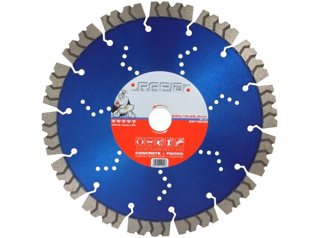 Kotouč řezný diamantový segmentový 230 x 15 x 22,2 mm RAPIDDiamantový segmentový kotouč s všestranným využitím při řezání různých druhů materiálu jako dlažební kostky, cihly, beton, železobeton, tvrdé materiály a další stavební materiály. Laserem navařené diamanty k tělu kotouče s precizně...