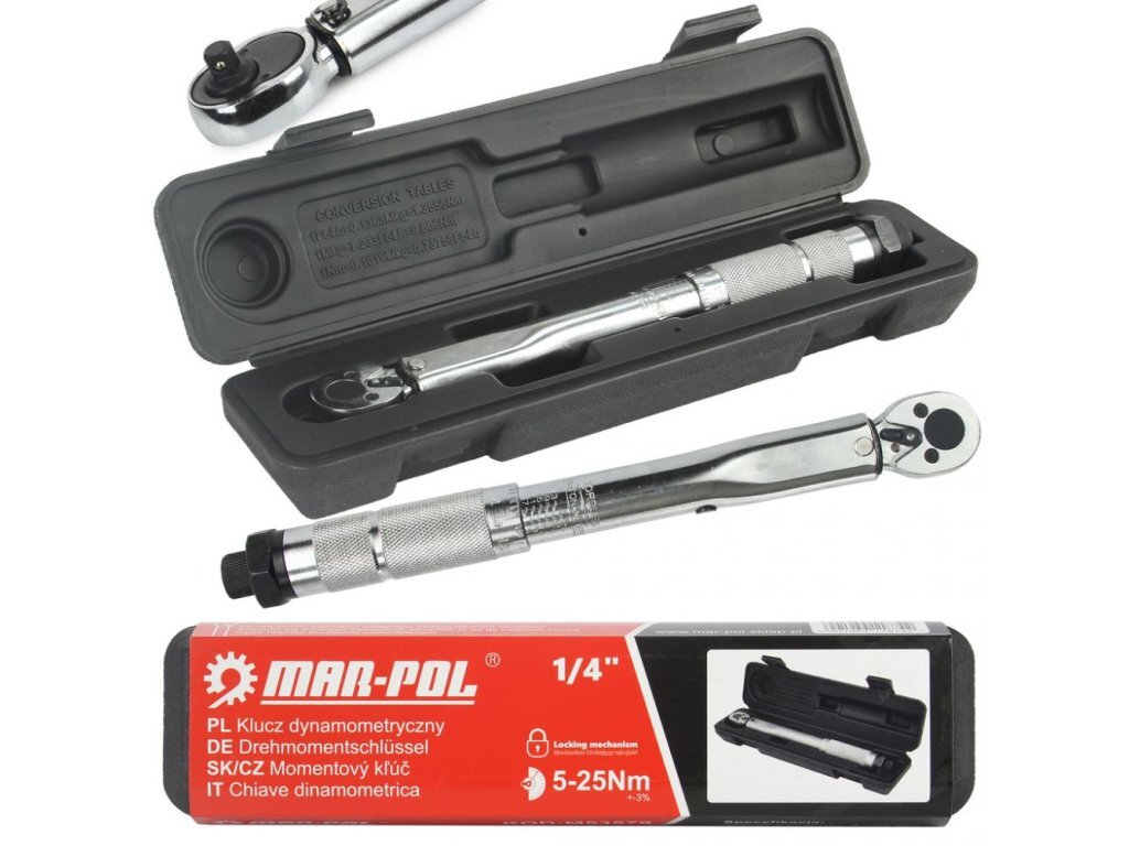 Momentový klíč profesionální polské značky Marpol 1/4" 5-25 Nm. Klíč je vyroben z vysoce kvalitní chrom-vanadové oceli (CrV).