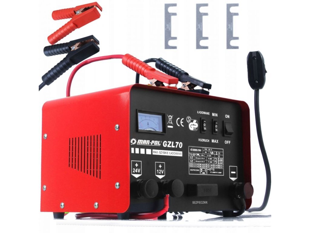 Nabíječka autobaterií 12/24V, funkce START s dálkovým ovládačem GZL-70 MAR-POLNabíječka je vybavena funkcí FAST CHARGE, která umožňuje rychlé nabití baterie, a asistenční funkcí START ovládanou přes praktický ovladač na kabelu o délce 130 cm, který je součástí nabíječky.Promyšlená konstrukce...