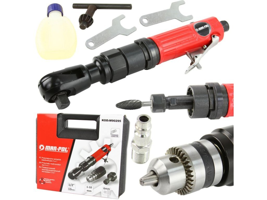 Pneumatický multifunkční nástroj 6,3bar, 3v1 MAR-POLPneumatický multifunkční nástroj 3v1 je praktická pomůcka do každé dílny. Tento nástroj představuje ráčnu, sklíčidlo a nástavec přímé brusky v jednom. Stačí jen vyměnit nástavce a nástroj bude plnit funkci jakou zrovna potřebujete. Jednoduchá...