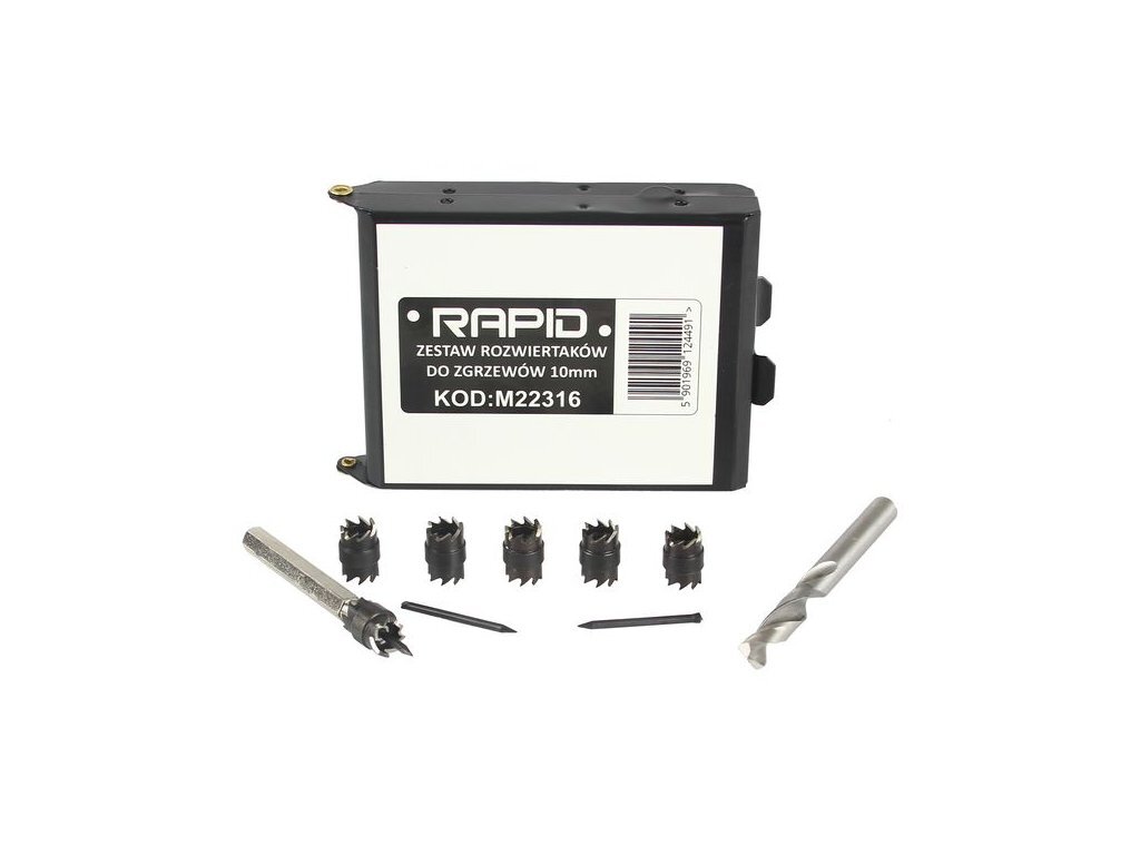 Frézky na bodové svary sada 10 ks RAPIDSada je určena k odstraňování bodových svarů, spojů karoserií automobilů.Jedná se o výstružník na svary s oboustrannými korunkovými frézami, vodícím hrotem a držákem 6-hran. Sada obsahuje:Oboustranné korunkové frézy: 6 ks  Vyměnitelné vodíci hroty: 3 ks... przeczytaj całość
