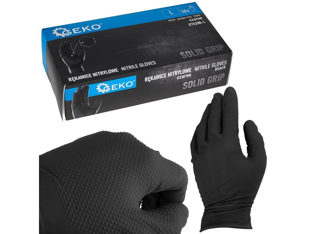 Nitrilové rukavice Solid Grip 3D, pevné, odolné chemikáliím, 50 ks, černé, velikost L - GEKONitrilové rukavice G75200 v černé barvě s diamantovou texturou, která zajišťuje vynikající úchop a ochranu rukou při práci v náročném prostředí. 3D diamantová textura zároveň umožňuje cirkulaci vzduchu...