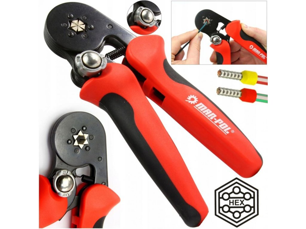 Kleště lisovací na dutinkové konektory 0,25-10mm² MAR-POLKleště lisovacís regulačním knoflíkem pro nastavení síly stisku čelistí pro neletované elektrické spoje k šestihrannému zalisování dutinkových koncovek/konektorů v rozsahu 0.25 - 10 mm² s bočním zaváděním.Specifikace: vícestupňový ráčnový...