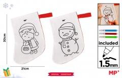Świąteczna skarpeta do pokolorowaniaWymiary: 20x30 cm.Wykonana z białej tkaniny poliestrowo-bawełnianej, miękka w dotyku, łatwa do kolorowania, z wyraźnymi nadrukowanymi motywami.W zestawie 3 flamastry (czerwony, zielony, żółty).Skarpeta i 3 markery są zapakowane razem w torbę OPP.Motyw...