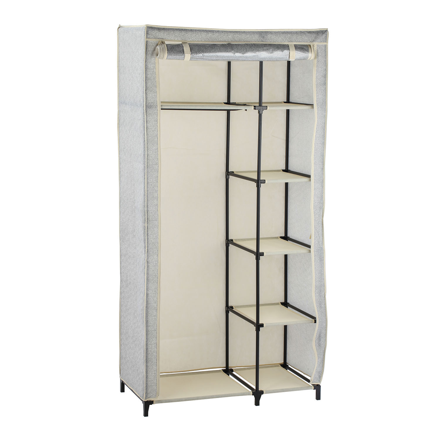 MSV látková šatní skříň, 6 přihrádek + tyč na ramínka, šedá, PP, železná konstrukce