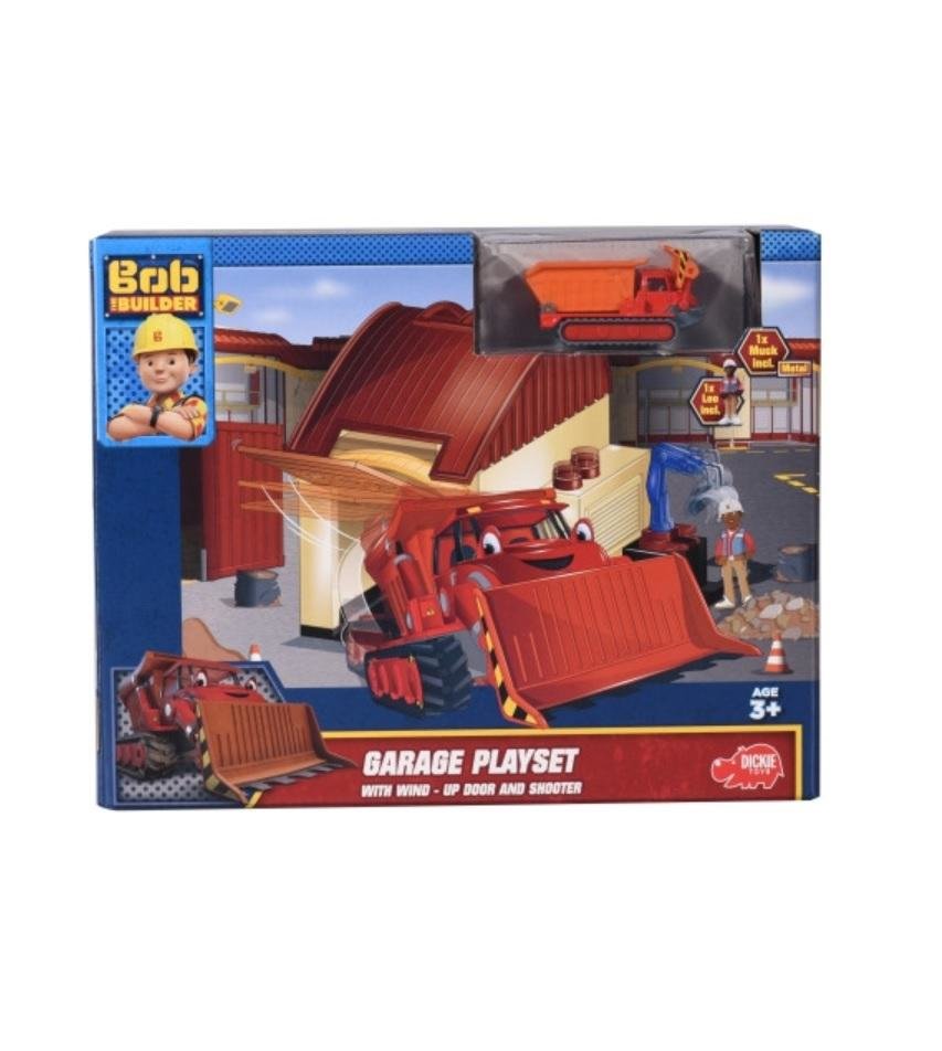 Zestaw z bajki Bob budowniczy zawierający spychacz, kompresor, garaż z podnoszonymi drzwiami i wyrzutnią, figurkę Wendy'ego i inne. przeczytaj całość