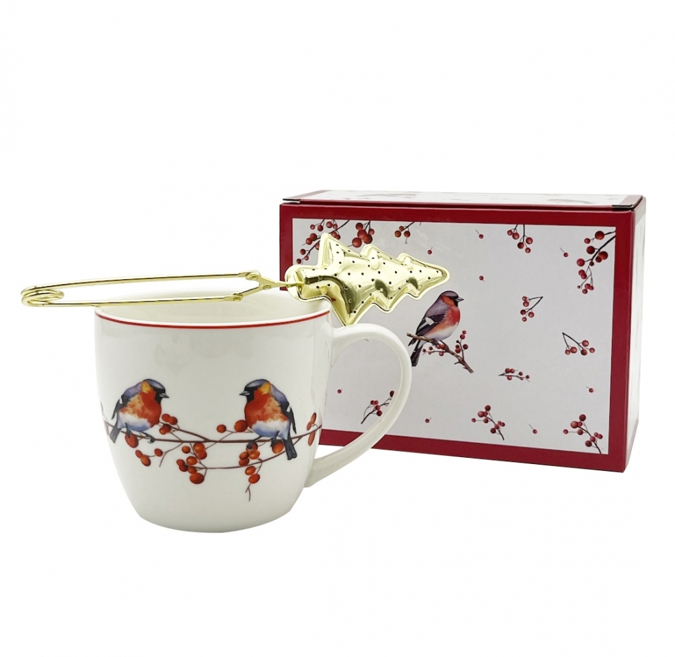 Porcelánový hrnek VÁNOČNÍ PTÁČCI 3, 460 ml v krabičce s kovovým sítkem na čaj
