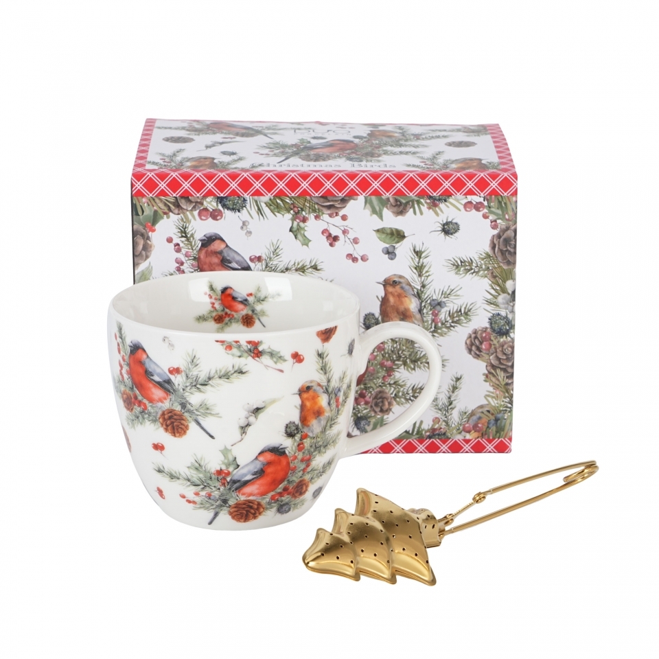 Porcelánový hrnek VÁNOČNÍ PTÁČCI 1, 460 ml v krabičce s kovovým sítkem na čaj