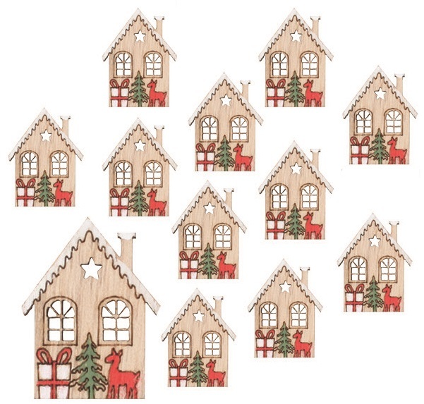 Domky s jelenem dřevěné s lepíkem 2,5 x 3,5 x 0,3 cm, 12 ks v sáčku