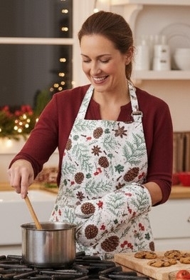 Vánoční kuchyňská chňapka Šišky BY101 Praktická vánoční chňapka s motivem šišek, jehličí, bobulek a koření na bílém podkladu je nezbytným pomocníkem každé hospodyňky. Chrání před teplem a zároveň krásně doladí sváteční atmosféru v kuchyni. Materiál a zpracování Vrchní i vnitřní část je ze 100%...