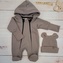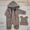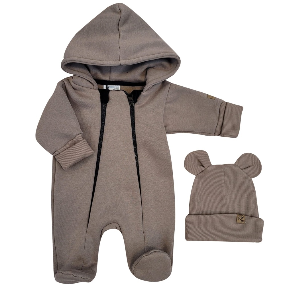 Oteplený dětský overal se šlapkama a kapucí + čepička, 2D, hnědá; 56 (1-2m); hnědá; bavlna, elastan