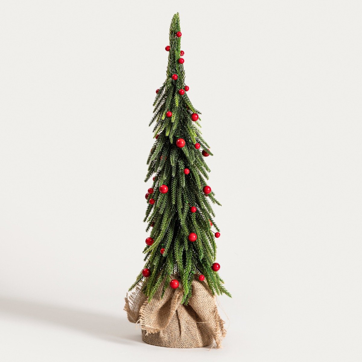 Krásně reprodukovaný strom v přírodních barvách. - Dekorativní ozdoby různých průměrů. - Základna potažená dekorativním materiálem s jutovou texturou. - Vysoce kvalitní materiál pro dlouhou životnost a atraktivní vzhled.55 cm umělý vánoční strom s červenými ozdobami.Na stůl, do obývacího pokoje,...
