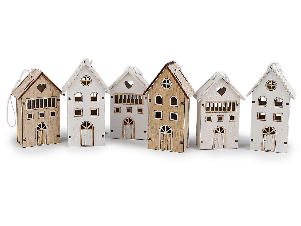 Dřevěné domečky mix k zavěšení - 6 ks - přírodní bílá