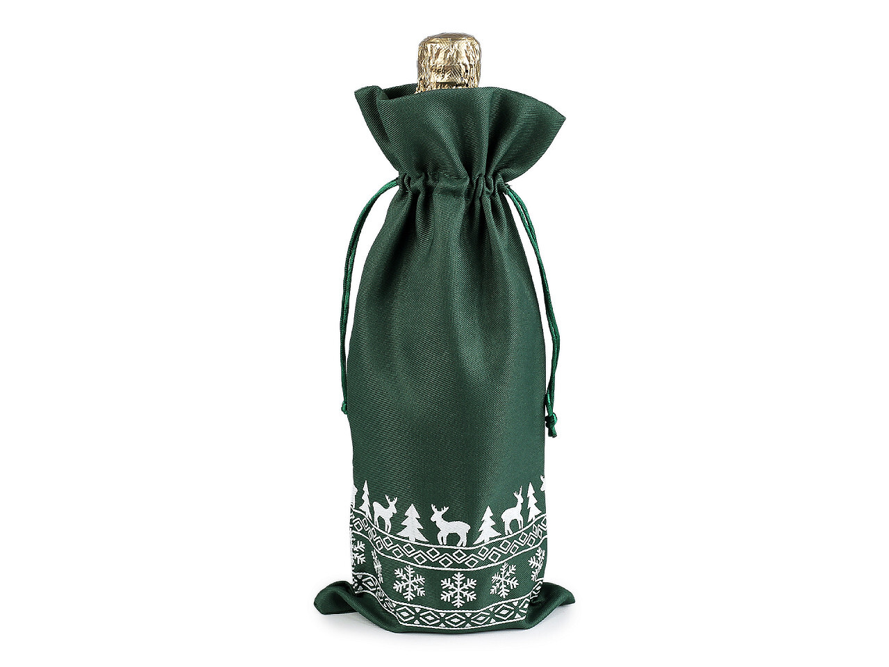 Vánoční dárkový pytlík je z obou stran ozdobený potiskem sobů, stromečků a vloček. Je určený na zabalení lahví a jiných podlouhlých dárků. Pytlík je dostatečně vysoký, ať už se rozhodnete pro dárek s alkoholem nebo s domácí limonádou, ušetří vám čas při balení. Stahuje se pomocí kulatých saténových šňůrek, dárku dodá osobní kouzlo a půvab.