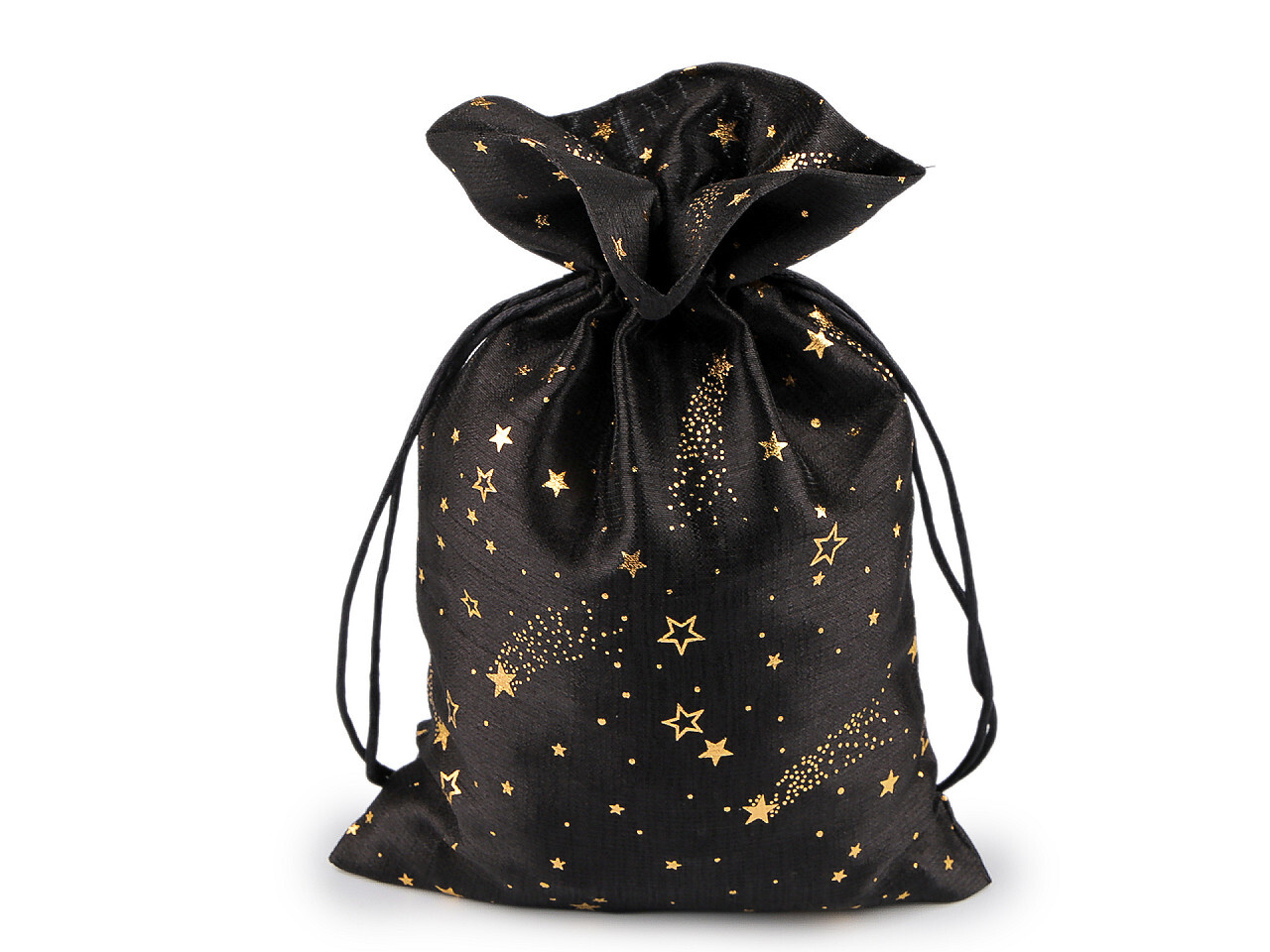 Vánoční dárkový pytlík je středně velký, z obou stran ozdobený potiskem zlatých metalických hvězdiček. Působí elegantně a luxusně, můžete ho použít na dárky nebo ho naplnit mikulášskou nadílkou, ušetří vám čas při balení. Dá se naaranžovat i jako vánoční dekorace. Stahuje se pomocí kulatých saténových šňůrek, dárku dodá osobní kouzlo a půvab.