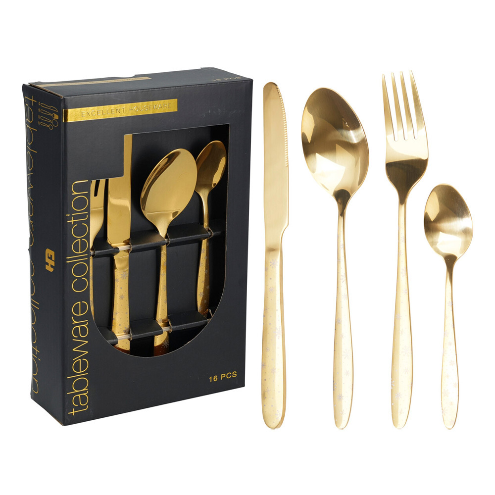 Sada příborů - nerezová ocel/zlatá se sněhem. Sada 16 kusů příborů s motivem sněhové vločk