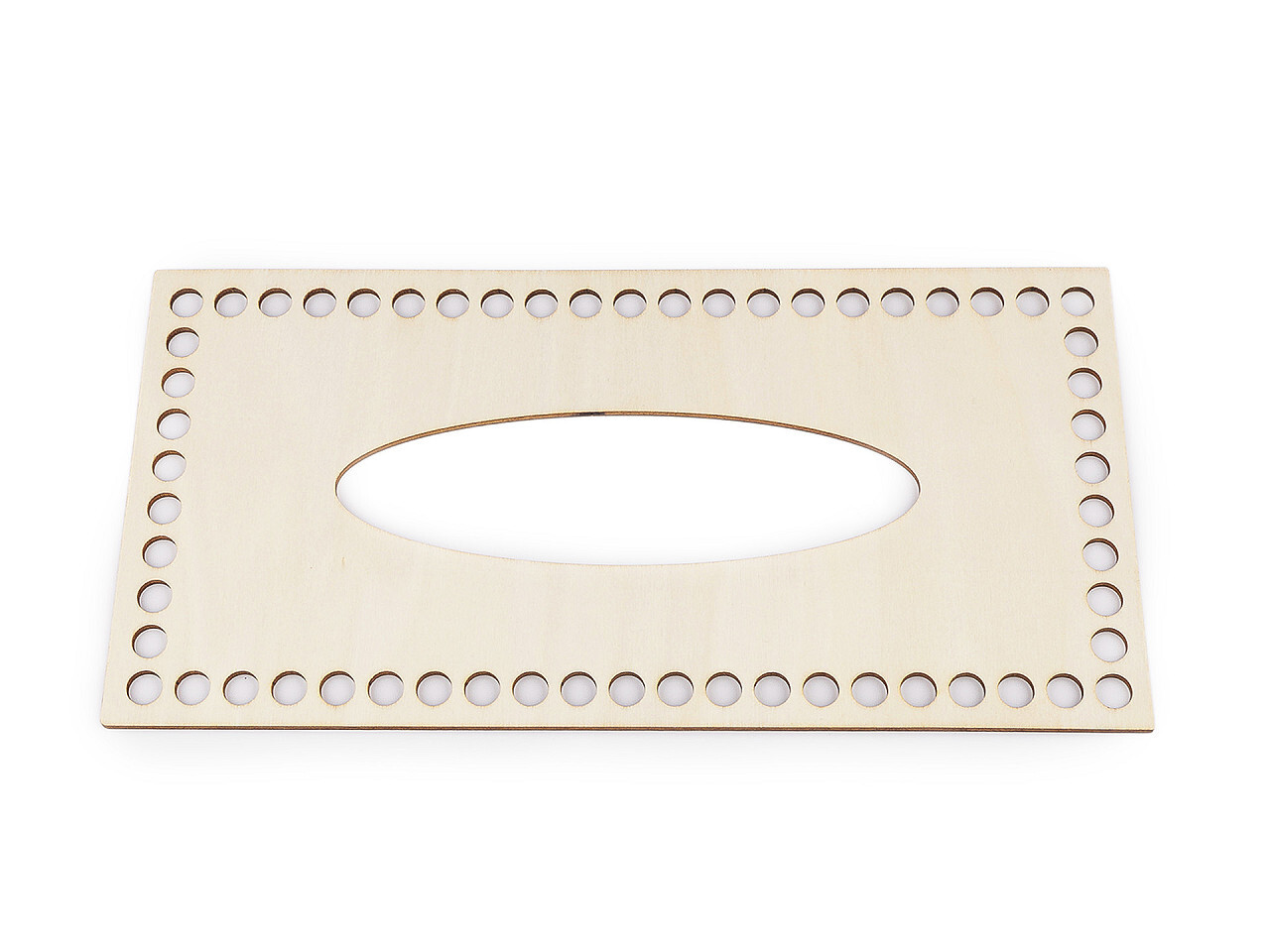 Dřevěné víko využijete k výrobě krabičky na kapesníky. Je přesně vyřezané laserem. Malé otvory po obvodu doplňuje jeden velký otvor uprostřed (4 x 14 cm).Polotovar se dá obháčkovat nebo do něj můžete proplést pedig.Můžete ho také domalovat např. akrylovými barvami, popisovači, glitrovými lepidly,...