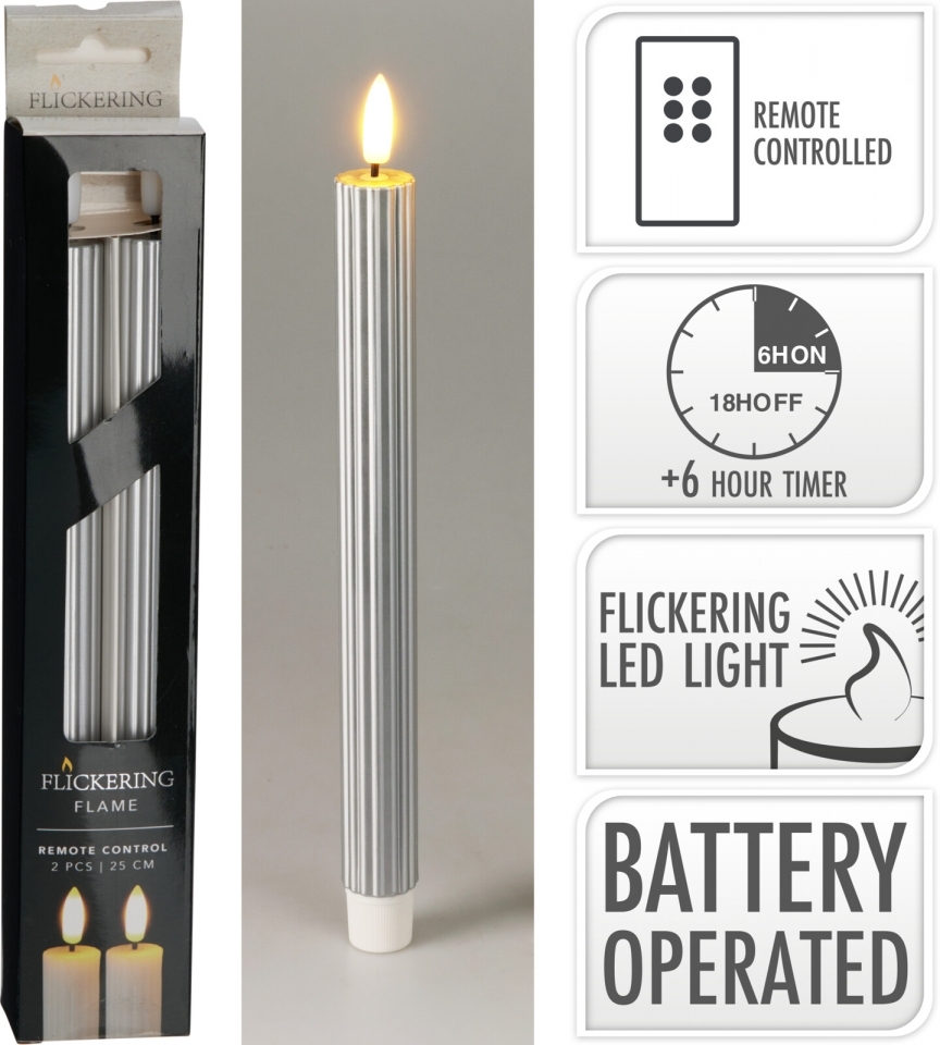 Sada 2ks stříbrných LED svíček s vroubkováním a blikajícím plamenem, 25 cm
