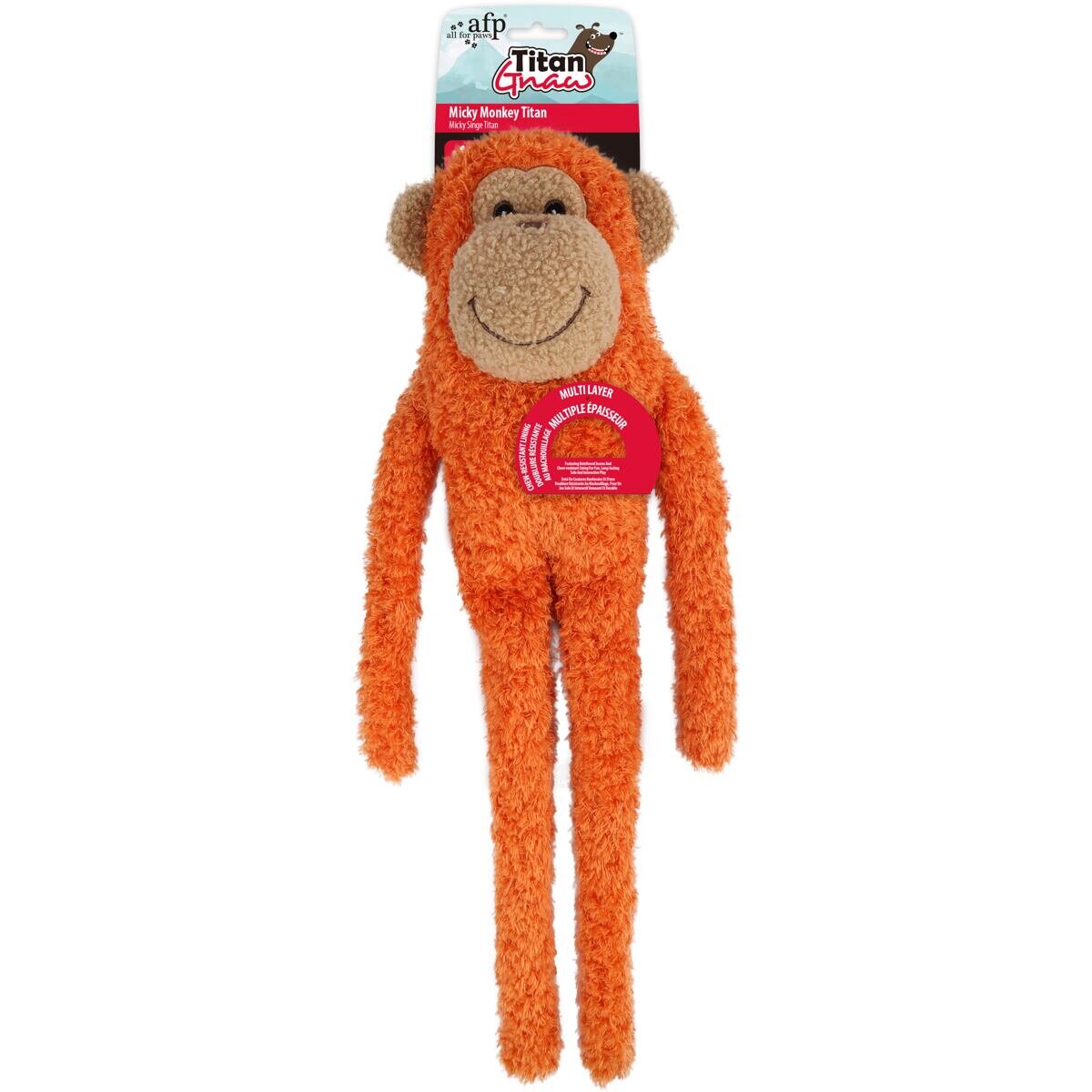 Opičák z kolekce Titan Gnaw je navržen speciálně pro psy, co se s hračkami „nepářou“!Díky zpevněným švům a odolné vnitřní vrstvě zvládne i divočejší hry, takže se hodí pro psy, kteří rádi hračku tahají, třepou nebo okusují. Jeho dlouhé ruce a nohy lákají ke kousání, třepání a přetahování – hra se...