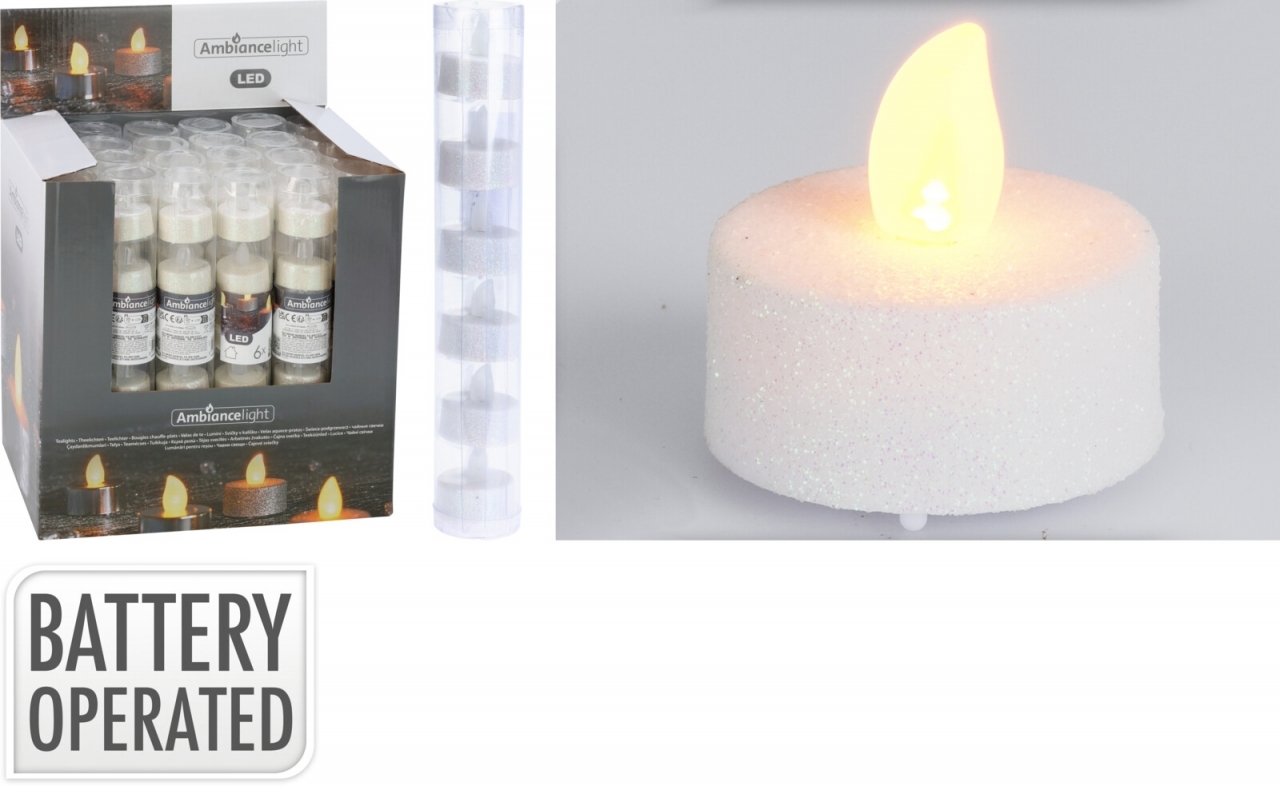 Bílá čajová LED svíčka s flitry - sada 6ks