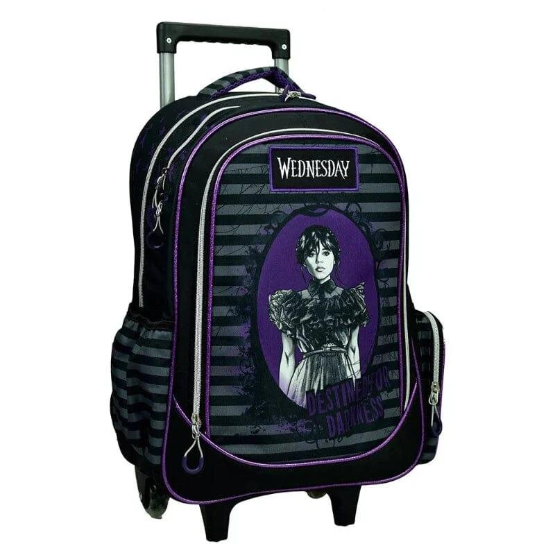 Prostorný trollej batoh s motivem Wednesday.dvě prostrorné hlavní klopy další přední kapsa pro snadný přístup k nejdůležitějším věcemzesílený mechanismus dvojitého nošení - buď jako batoh anebo trolley na kolečkáchnastavitelný se dvěma polohami pro pohodlné nošenídvě boční kapsy na lahve s...
