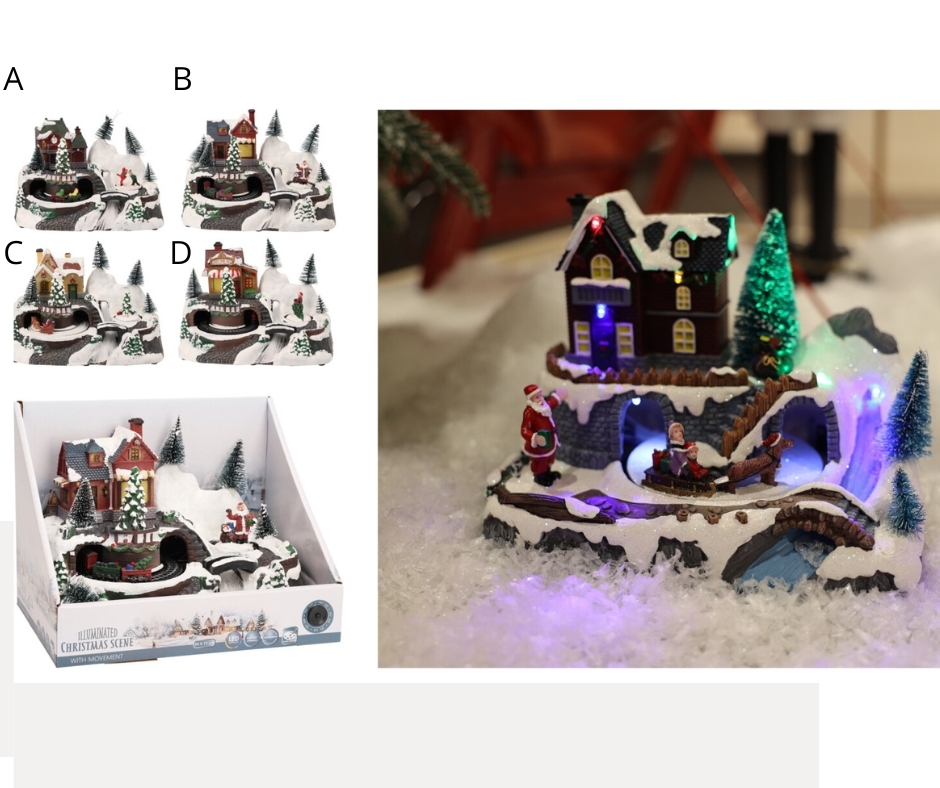 Vánoční LED pohyblivá scenérie B, 24 cm - Santa, vláček, dům