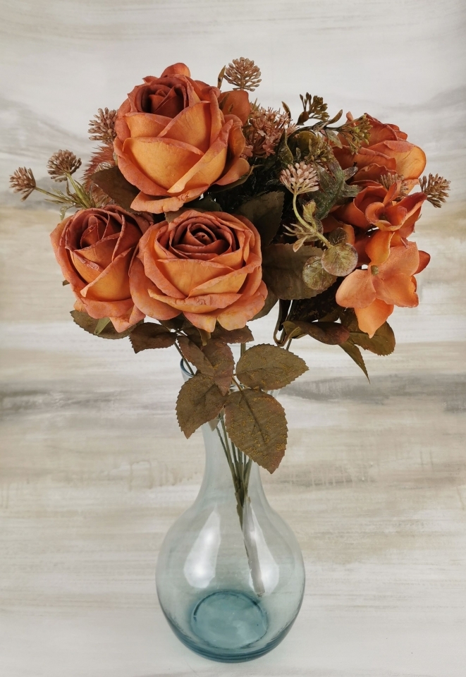 Umělá kytice růže / bodláky / hortenzie 28 x 28 cm, oranžová