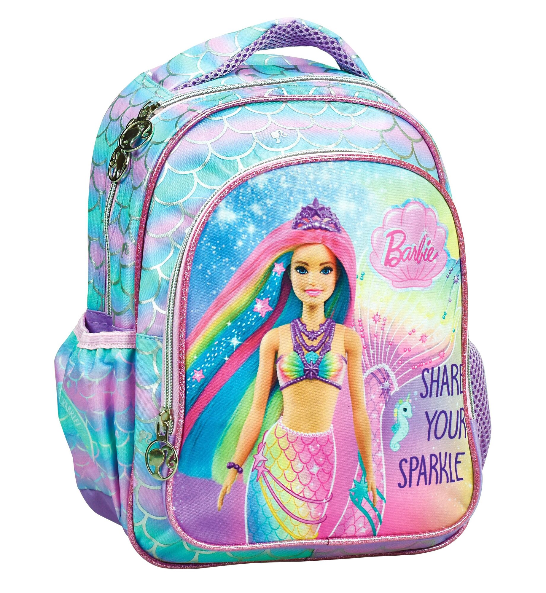 Dětský batoh s motivem Barbie.jedna hlavní klopa jedna přední kapsa pro snadný přístup k nejdůležitějším věcemdvě boční kapsy na lahve s pitímnastavitelné ramenní popruhyodolná, zesílená rukojeť pro snadné nošení v rucefialová barvaRozměry: 30 x 25 x 15 cm.Materiál: polyester.Hmotnost: 0,36...