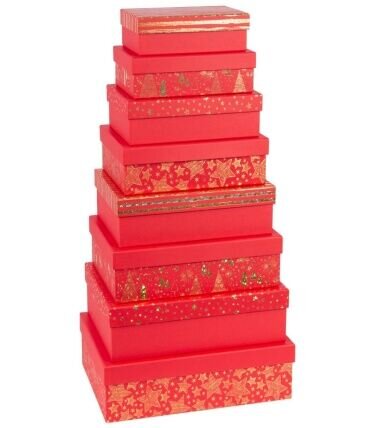 Sada dárkových krabic.Rozměry: 14,5 x 10 x 5 cm; 17 x 12 x 5,5 cm; 9 x 13,5 x 6 cm; 22 x 16 x 6,5 cm; 24,5 x 17,5 x 7 cm; 27,5 x 19,5 x 7,5 cm; 29 x 21 x 8 cm; 33 x 23.5 x 9 cm; 35 x 25 x 10 cm; 37 x 27 x 13 cm przeczytaj całość