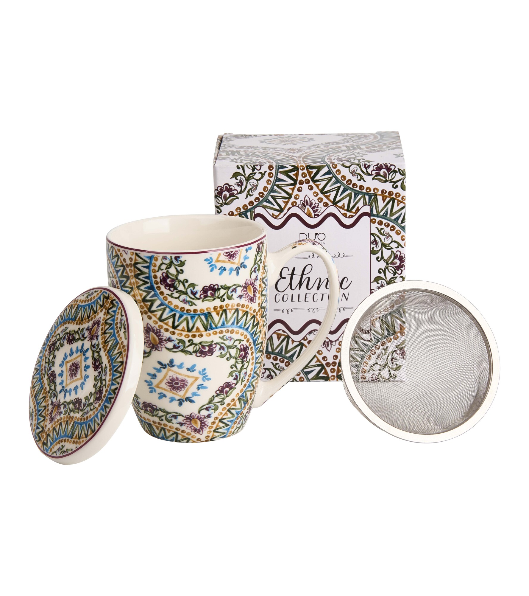 Kubek z zaparzaczem ESTRELLA wchodzący w skład linii ETHNIC, wykonany z porcelany New Bone China, charakteryzującej się elegancką i naturalną kremowo - białą barwą z delikatnym połyskiem a także wyjątkową wytrzymałością przy zachowaniu lekkości i delikatności.Linia zdobiona abstrakcyjnym...