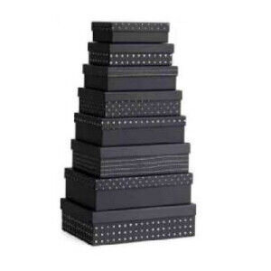 Sada dárkových krabic.Rozměry: 14,5 x 10 x 5 cm; 17 x 12 x 5,5 cm; 9 x 13,5 x 6 cm; 22 x 16 x 6,5 cm; 24,5 x 17,5 x 7 cm; 27,5 x 19,5 x 7,5 cm; 29 x 21 x 8 cm; 33 x 23.5 x 9 cm; 35 x 25 x 10 cm; 37 x 27 x 13 cm przeczytaj całość