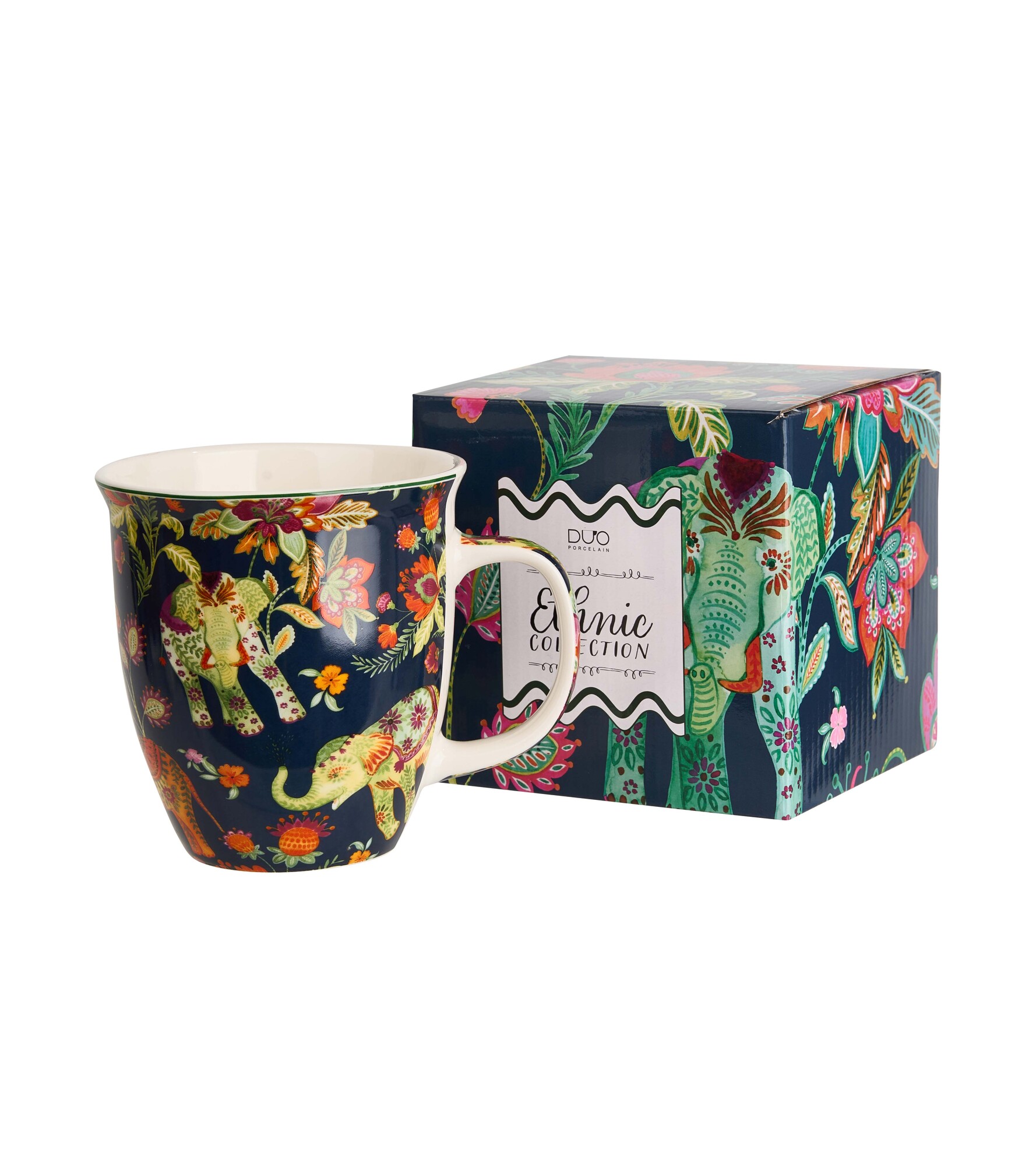 Kubek 650 ml ANKUR BLUE wchodzący w skład linii ETHNIC, wykonany z porcelany New Bone China, charakteryzującej się elegancką i naturalną kremowo - białą barwą z delikatnym połyskiem a także wyjątkową wytrzymałością przy zachowaniu lekkości i delikatności.Linia zdobiona motywem indyjskiego słonia...
