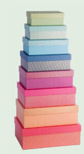 Sada dárkových krabic.Rozměry: 14,5 x 10 x 5 cm; 17 x 12 x 5,5 cm; 9 x 13,5 x 6 cm; 22 x 16 x 6,5 cm; 24,5 x 17,5 x 7 cm; 27,5 x 19,5 x 7,5 cm; 29 x 21 x 8 cm; 33 x 23.5 x 9 cm; 35 x 25 x 10 cm; 37 x 27 x 13 cm przeczytaj całość