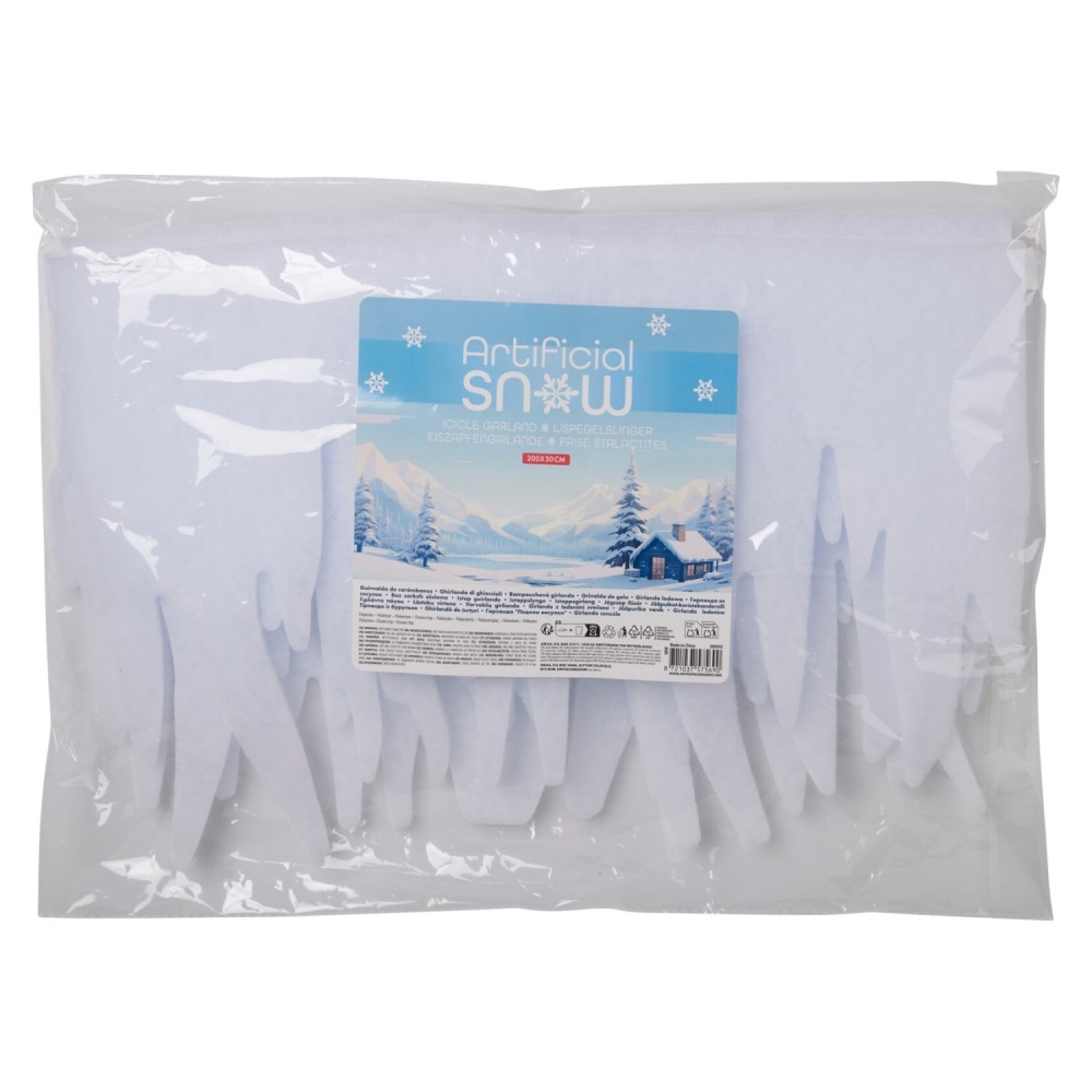 Umělý sníh s rampouchy, nehořlavý materiál.200 x 30 cm (šířka x výška)hmotnost: 80g przeczytaj całość