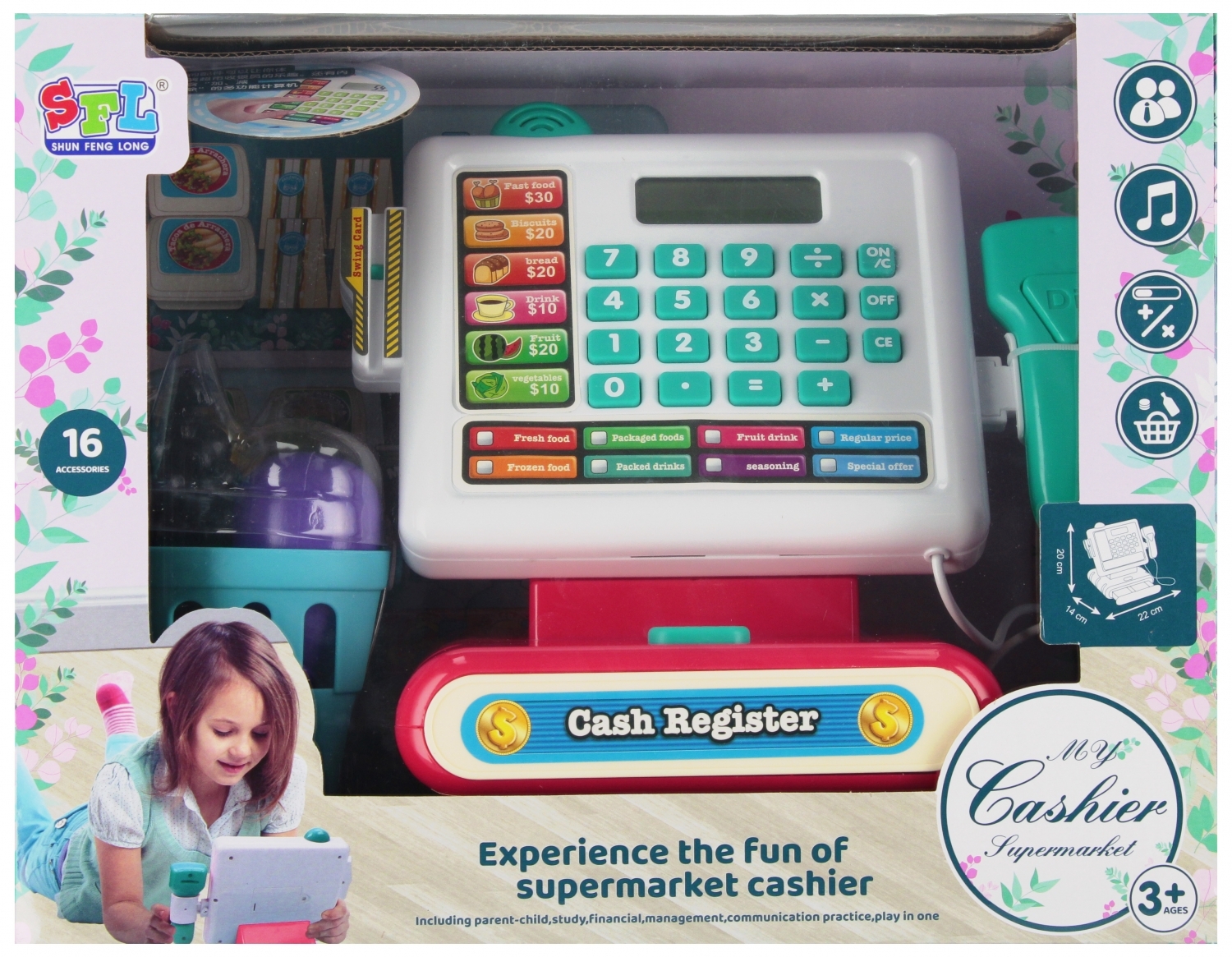 Zalety produktu: kasa sklepowa mały supermarket z 16 akcesoriami, wyposażona jest we wszystko czego potrzebuje sprzedawca koszyk z artykułami spożywczymi, dzięki czemu zabawa jest atrakcyjniejsza, kasa posiada efekty dźwiękowe, czytnik skanerem produktów przy kasie wydającym efekt dźwiękowy...