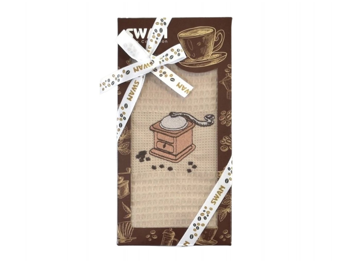 ☕ Utěrka SWAN Mlýnek hnědý – 1 ksElegantní kuchyňská utěrka v hnědé barvě s výšivkou mlýnku na kávu. Dodává se v dárkovém balení s dekorativní stuhou – ideální dárek pro milovníky kávy a stylového stolování. przeczytaj całość