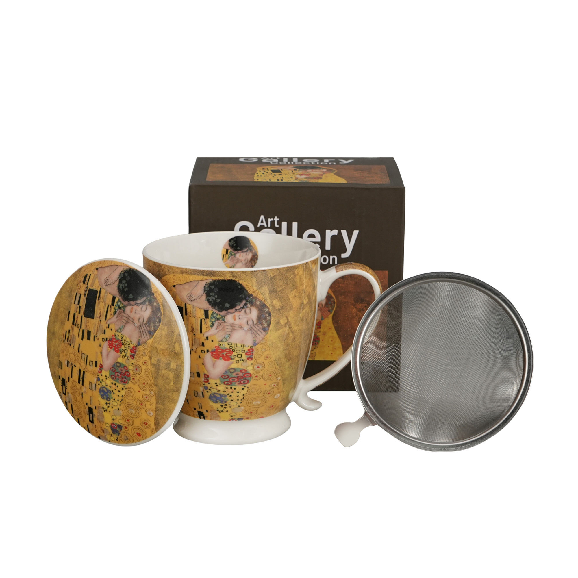 Kubek z zaparzaczem na stopce KISS CLASSIC inspired by G.Klimt wchodzący w skład serii Art Gallery, wykonany z porcelany New Bone China, charakteryzującej się elegancką i naturalną kremowo - białą barwą z delikatnym połyskiem, a także wyjątkową wytrzymałością.Doskonały do przyrządzania ulubionych...
