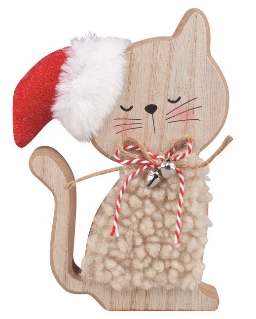 Kočka v červené čepici, dřevěná dekorace na postavení, 12 x 15,5 x 2,5 cm Roztomilá dřevěná kočka v červené zimní čepici rozveselí každý kout vašeho domova. Díky stabilnímu podstavci je ideální jako stojící dekorace na parapet, polici, komodu nebo sváteční stůl. Svým hravým vzhledem potěší malé...