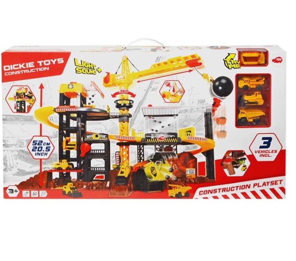 Zestaw budowlany, 79 cmDuży zestaw budowlany wyposażony w 4 metalowe pojazdy, światło i dźwięk, dźwig, wierzą z windą, obrotowe platformy, transporter, akcesoria: kula do rozbiórki, materiały budowlane, szer.: 79 cm, wys.: 52 cm, 3 l+ przeczytaj całość