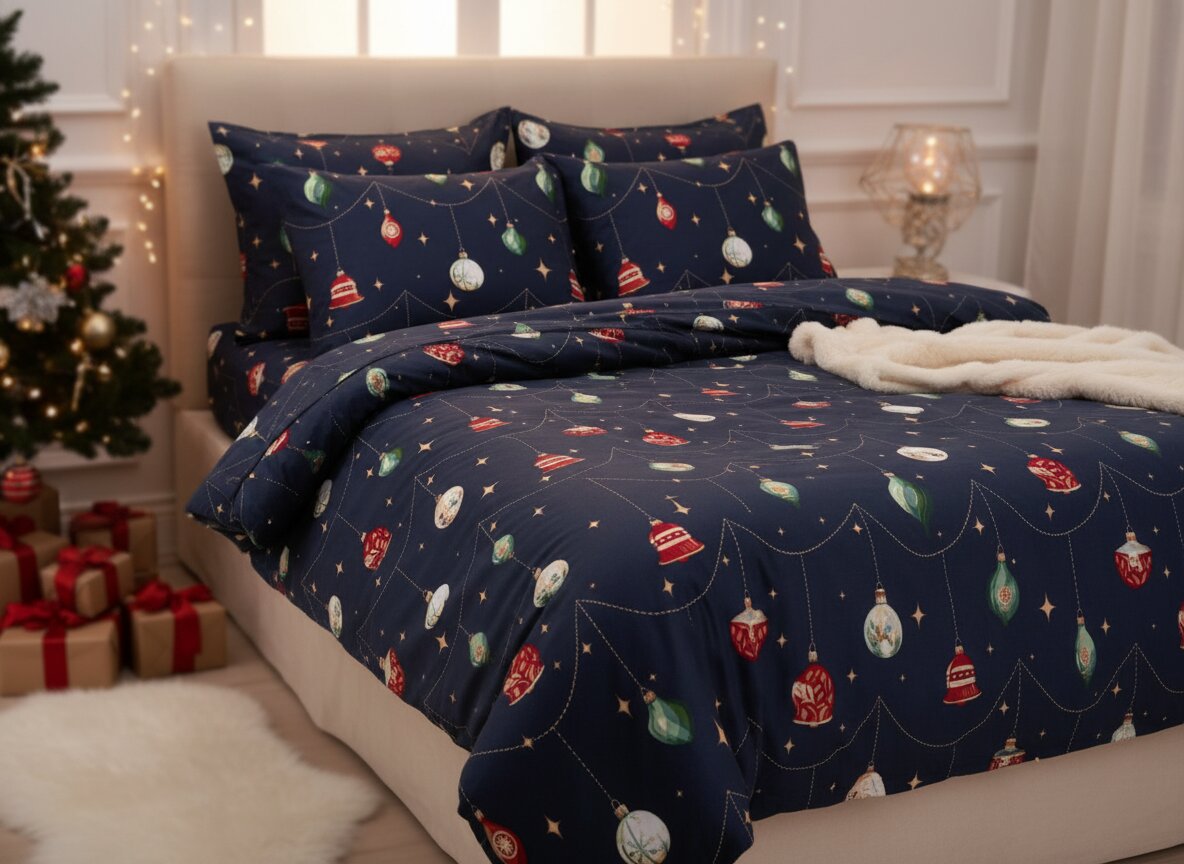 Vánoční francouzské ložní povlečení na společnou přikrývku z mikrovlákna v rozměru 220x200 cm s 2 kusy povlaků 70x80 cm s moderním vánočním motivem. przeczytaj całość