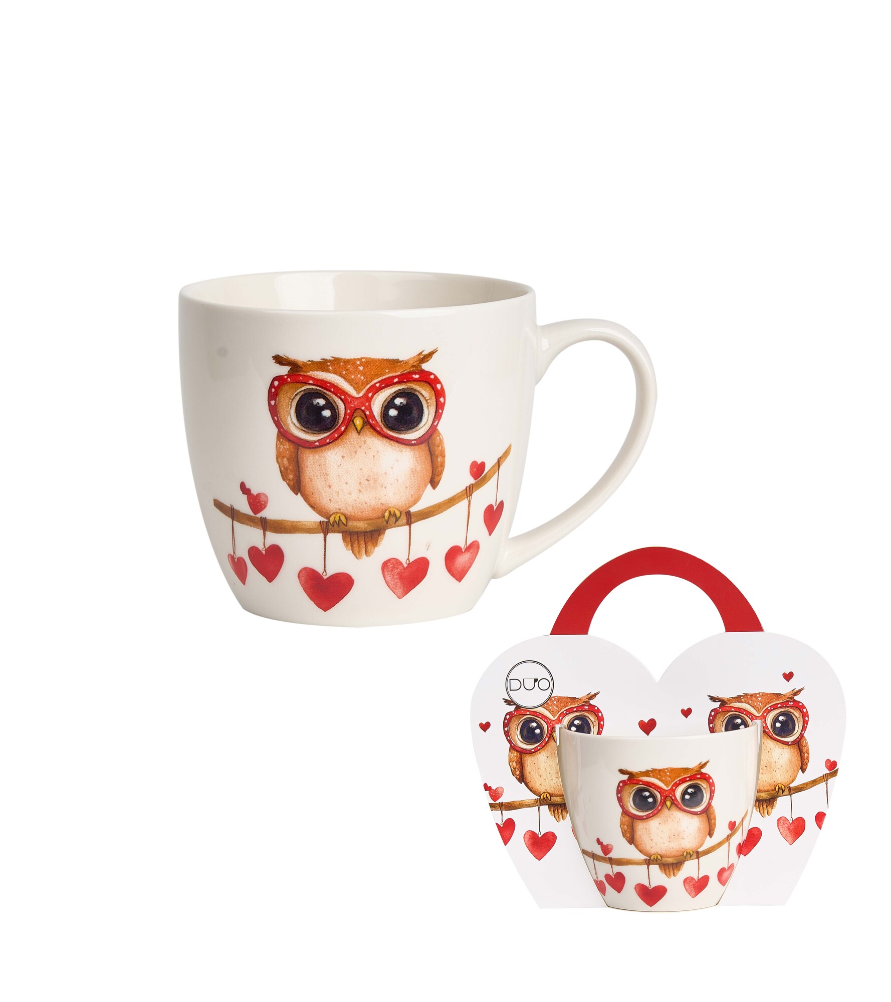 Kubek 460 ml w "koszyczku" SOWA wchodzący w skład serii SERCA, charakteryzuje się naturalnym kremowo-białym kolorem z delikatnym połyskiem oraz wyjątkową wytrzymałością i trwałością, zachowując lekkość i finezję.Linia zdobiona motywem wesołej sowy w czerwonych okularach siedzącej na gałęzi...