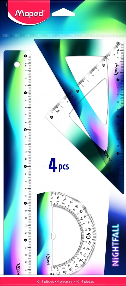 Geometryczny zestaw linijek z kolekcji Nightfall.W skład zestawu wchodzą 4 elementy: linijka 30 cm, ekierka 45° - 21 cm, ekierka 60° - 21 cm, kątomierz 180° - 12 cm.Cały zestaw jest ozdobiony grafikami w kolorze niebiesko-zielono-różowym. przeczytaj całość