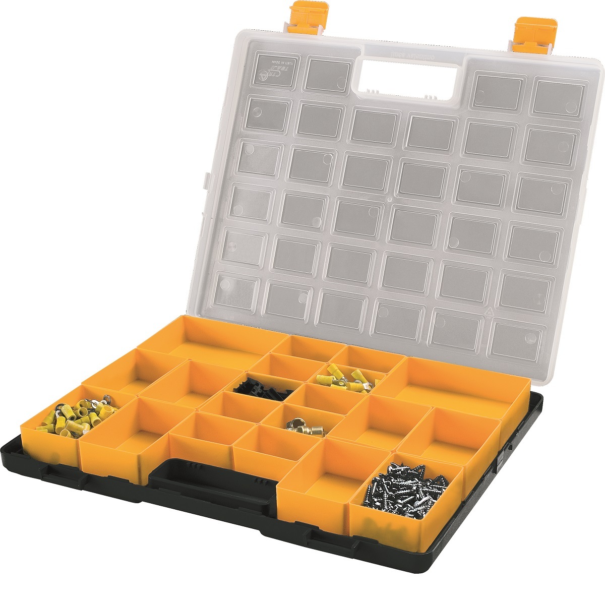 Plastový organizér s průhledným víkem, 3velikosti vyjímatelných boxů, rozměr 37,2 cm x 31,4 cm x 4 cm.Organizér s průhledným víkem a 20 boxy na nejrůznější předměty používané nejen v dílně, ale i domácnosti.Velikosti boxů10x vyjímatelný box ART187 (57x45x32mm)8x vyjímatelný box ART188... przeczytaj całość
