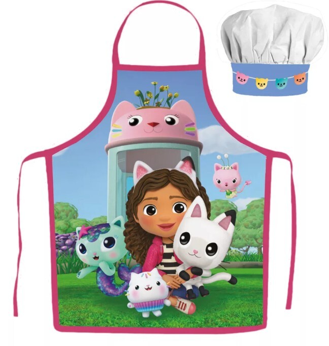 Pojďme vařit s Gábinkou! A k tomu dětem pomůže tato krásná dětská zástěra s úžasným motivem plným pohádkových kamarádů vašich dětiček. Obvod zástěrky lze přizpůsobit tkalounem a obvod čepice zas pomocí suchého zipu. Zástěrku děti využijí i při kreativním tvoření, malování a dalších dětských...
